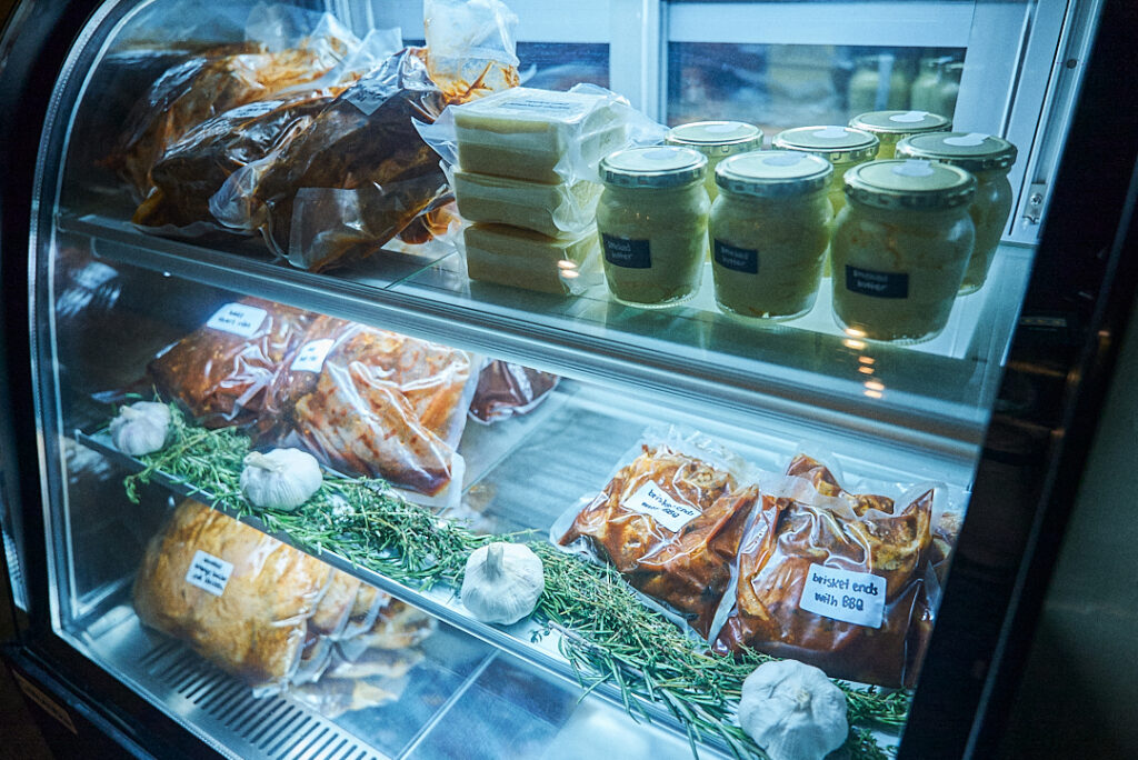 Browse a selection of smoked meats, cured cuts, smoked cheeses and butters, fresh organic produce, raw honey and small-batch ferments. Try our signature smoked mayonnaise and other in house condiments.